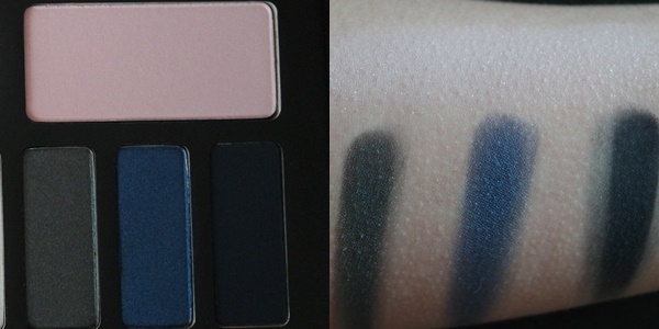 Pour finir, Lucid est un fard XXL de couleur rose pale pailleté. C’est celui qu’on voit le moins sur les photos car il est le moins soutenu de toute la palette. En contraste avec celui-ci, on a Graphic Nature, un gris anthracite irisé, Entombed, un bleu roi irisé également et Tornay, un bleu marine mat. A la vue des swatches, tu l’auras compris; ils sont hyper pigmentés. Et c’est un gros plus de la palette.