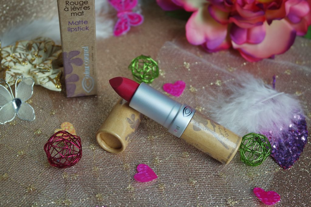 Il faut savoir que les rouges à lèvre mats – vraiment mat – c’est assez difficile d’en trouver dans le monde des cosmétiques bio. Alors, quand est arrivé le jour sacré du Black Friday, j’en ai profité pour faire une « petite » commande chez Couleur Caramel et ai donc jeté mon dévolu sur un rouge à lèvre naturel « mat » en teinte n°123 Rose Vif . Sur le site, il fait vraiment rose alors qu’en vrai, il tire plus sur le rouge… Mais sa couleur n’en est pas moins jolie, au contraire ! Elle est magnifique !
