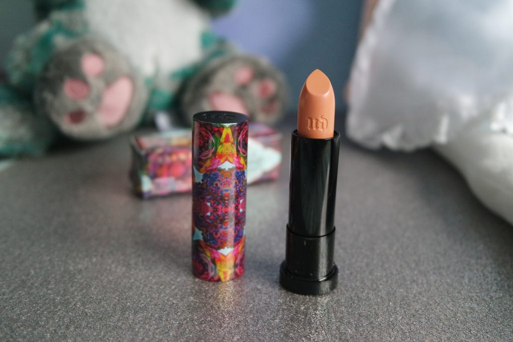Le design du tube est assez basique, il porte le même motif psychédélique que la palette et le raisin est également classique. On retrouve les initiales d’Urban Decay dessus. Inspiré du personnage d’Alice, on a une teinte vraiment nude, une sorte de beige orangé nacré avec des reflets roses assez doux. Il n’est pas trop sec ni crémeux et s’applique assez bien.