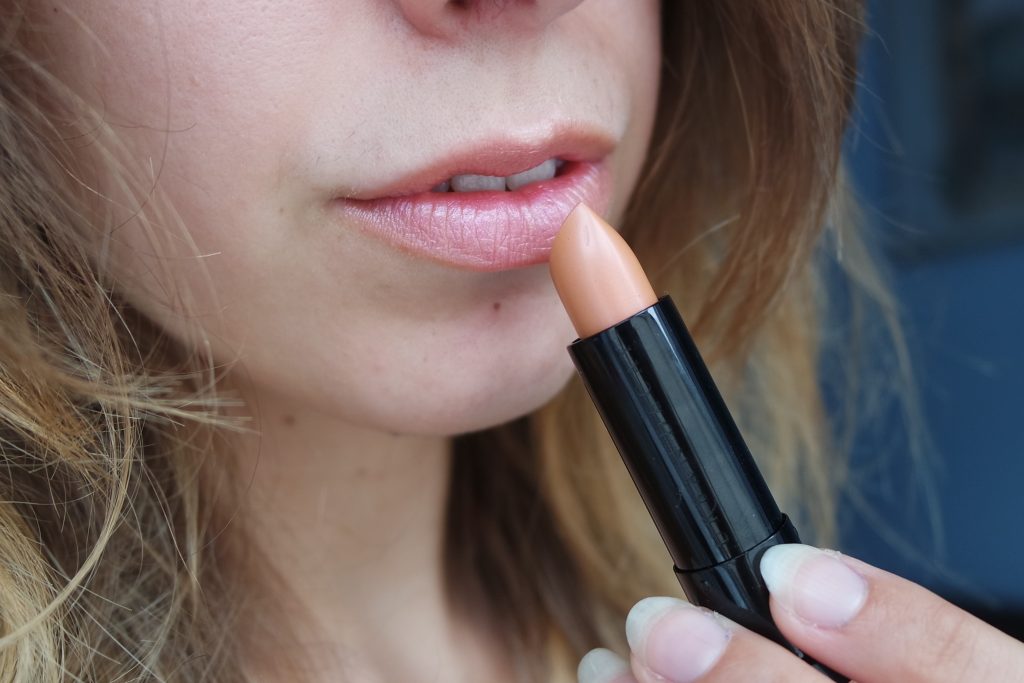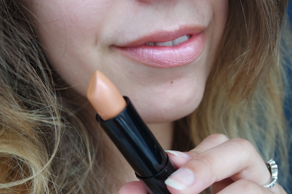 Son rendu m’a un peu déçu car je m’attendais à ce qu’il colore plus les lèvres que cela, au final, il donne juste un effet nacré. C’est joli mais je m’attendais à avoir un rendu plus orangé. De plus, il file directement dans les plis des lèvres ce qui est un peu énervant… Au niveau de la tenue, une retouche après le repas est nécessaire.