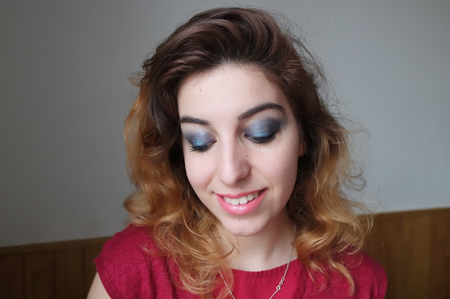 Trêve de bavardage, pour réaliser ce make-up, j’ai d’abord appliqué en coin interne et externe de la paupière mobile Evidence, un bleu foncé satiné. Puis j’ai posé au milieu Madness qui est plus clair et plus pailleté, pour ensuite mettre Prank sur la paupière supérieure en l’estompant bien dans le creux. Je l’ai également appliqué en ras de cils inférieurs. Pour finir, j’ai dessiné un trait au crayon noir en ras de cils supérieurs et dans la muqueuse, du mascara et un rouge à lèvre clair pour ne pas charger.