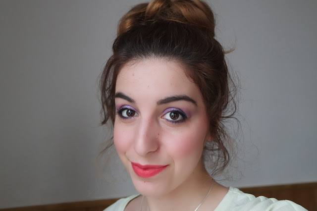 Pour ce faire, j’ai utilisé Omen en le posant du coin interne de l’oeil au milieu de la paupière mobile que j’ai fondu avec le sublime Voodoo en coin externe. J’ai estompé Flashback au dessus de la paupière puis j’ai ajouté de l’eye-liner, un crayon noir à l’interieur de la muqueuse et du mascara. Pour les lèvres, j’ai choisi Peach Club de l’Edition Velvet de Bourjois afin de contraster avec le violet. Enfin, j’ai mis Baby Love de Too Faced en blush toujours pour contraster et ne pas trop maquiller mes joues par rapport au maquillage assez coloré.
