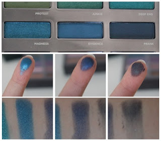 un bleu roi irisé, Evidence, un bleu foncé satiné et Prank un bleu nuit dont les paillettes sont vertes. Encore une fois, des fards pigmentés bien qu’ici, Prank l’est moins. C’est assez dommage car c’est une superbe couleur qu’on ne voit pas souvent.