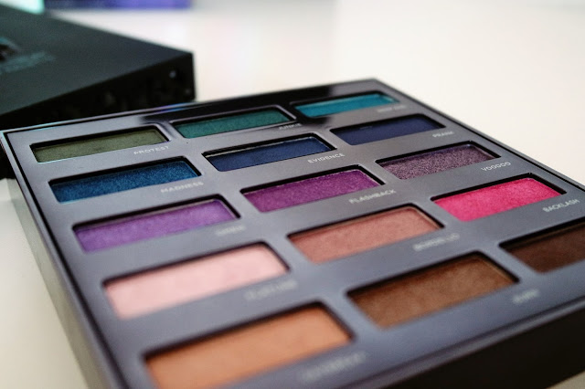 De base, c’est une palette assez sobre, carrée et noire, matte. J’ai été surprise par la taille car je la voyais plus grande… Sinon, on retrouve les initiales de la marque en violet foncé en relief au milieu du couvercle, ainsi que le nom de la palette. En l’ouvrant, on découvre que le fond du couvercle est un miroir. Le socle contenant les fards est brillant, moins foncé que le couvercle, miroitant… En bref, on retrouve bien l’ADN d’Urban Decay, sombre, voire un peu gothique, mystérieux. Un emballage simple mais efficace, en contraste avec les fards, que je vais te présenter maintenant !