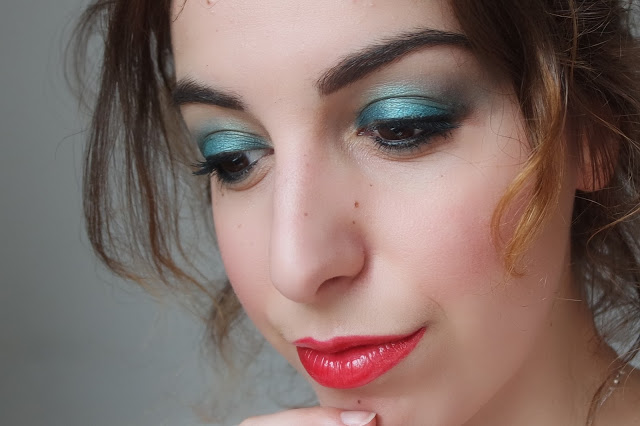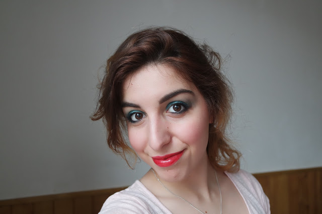 Je me suis servi des fards verts pour réaliser ce maquillage. J’ai donc commencé par mettre Protest sur la paupière non mobile en l’estompant bien et aussi en ras de cils inférieur, puis j’ai posé Junkie du coin interne au milieu de la paupière mobile et Deep End du milieu au coin externe. J’ai ensuite estompé pour fondre ces deux couleurs. J’ai mis du noir avec un crayon dans la muqueuse et en ras de cils supérieurs, du mascara et un rouge à lève bien rouge pour faire ressortir le vert.Et puisque cette palette regorge de couleurs, je compte faire un article par jour cette semaine pour te montrer ce dont elle est capable car je trouve ça dommage de ne montrer qu’un aspect de celle-ci !
