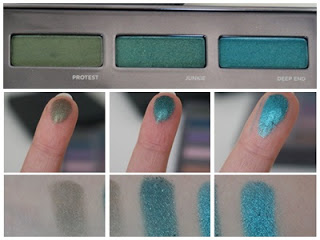 La palette est composée de 15 fards, satinés, irisés et pailletés, allant du vert au doré, passant par le bleu, le violet et le rose.Ces trois fards sont bien pigmentés, bien que le premier un peu moins. Hormis cela, ils font peu de chutes et s’appliquent bien.